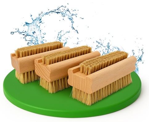Aus einem Buchenholz mit feinen Kunststoffborsten gefertigt. Ideal zum Reinigen der Handflächen oder Finger bzw. Nägel.
