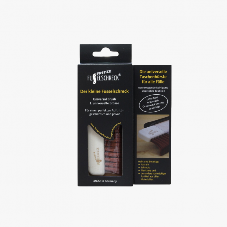 Known as the pocket brush, this compact tool was developed for removing hair and lint from clothing. The single‑row bristles claw into the fabric and loosen dirt effectively. For convenient storage, the brush comes with a protective case that prevents the bristles from being pressed down. Its small size makes it easy to carry in trouser or handbag pockets, ensuring it is always at hand.