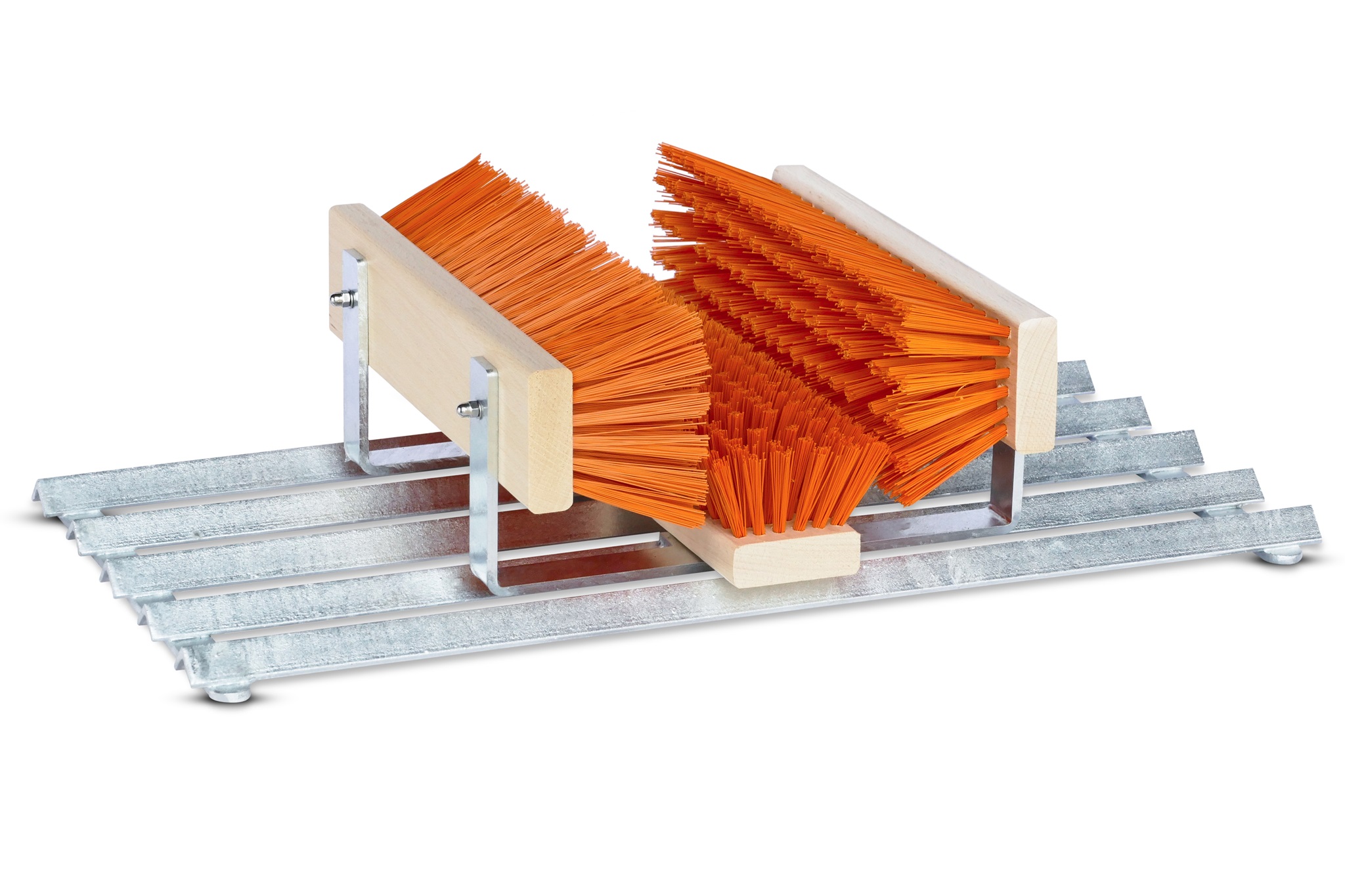 Grober Schmutz wird bei einem sicheren Stand an den seitlichen Winkelprofilen abgetreten. Feinere Verunreinigungen werden im Anschluss von den drei Reinigungsbürsten herausgelöst.