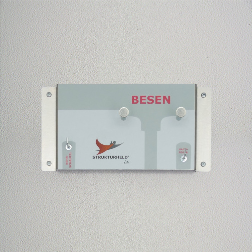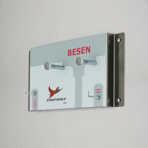 Der Strukturheld Lite ist eine platzsparende Reinigungsstation für Besen, Handfeger und Kehrschaufel. Alles hat seinen fest vorgeschriebenen Platz, sodass es keine Unordnung gibt. Sein schlichtes Design fügt sich in Firmen, Kommunen aber auch Gewerbebetrieben stimmig ein.